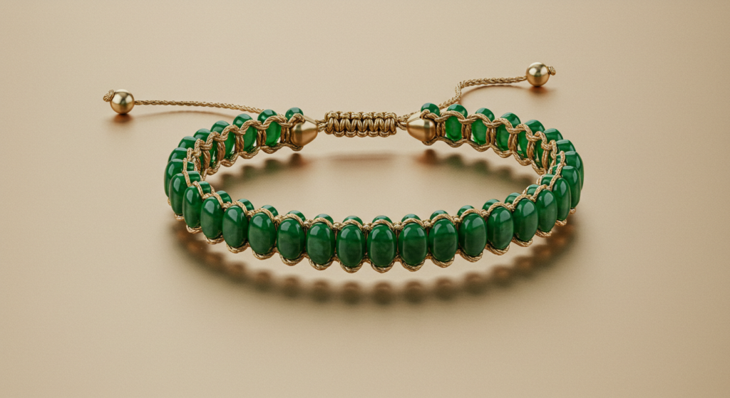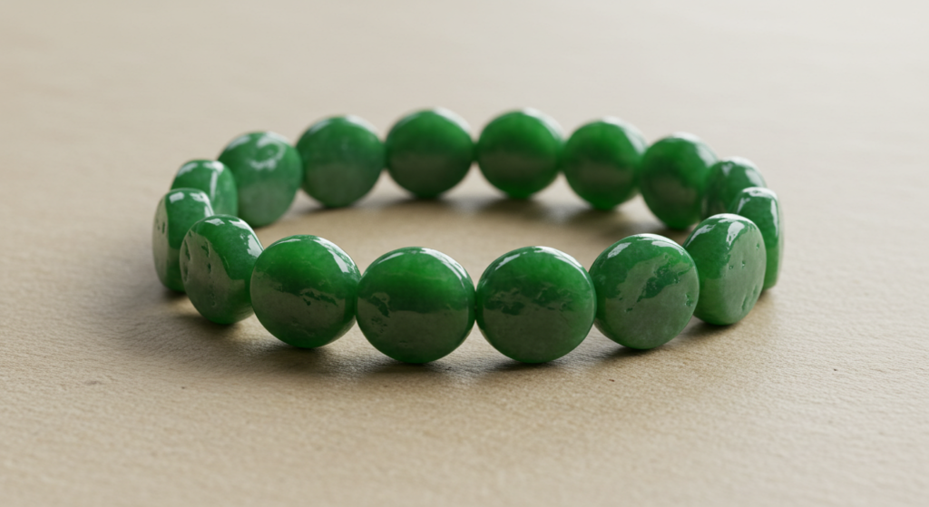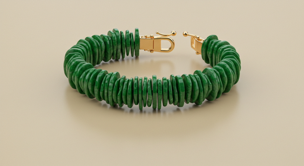 : For those who seek deeper hues, we present the “Forest Whispers” pendant. A lush, deep green Jadeite disc hangs from a twisted gold chain. The stone’s surface reveals intricate patterns, reminiscent of ancient forests. As sunlight dances upon it, you’ll catch glimpses of hidden ferns and moss. This pendant is a secret keeper—a talisman for grounding and growth.